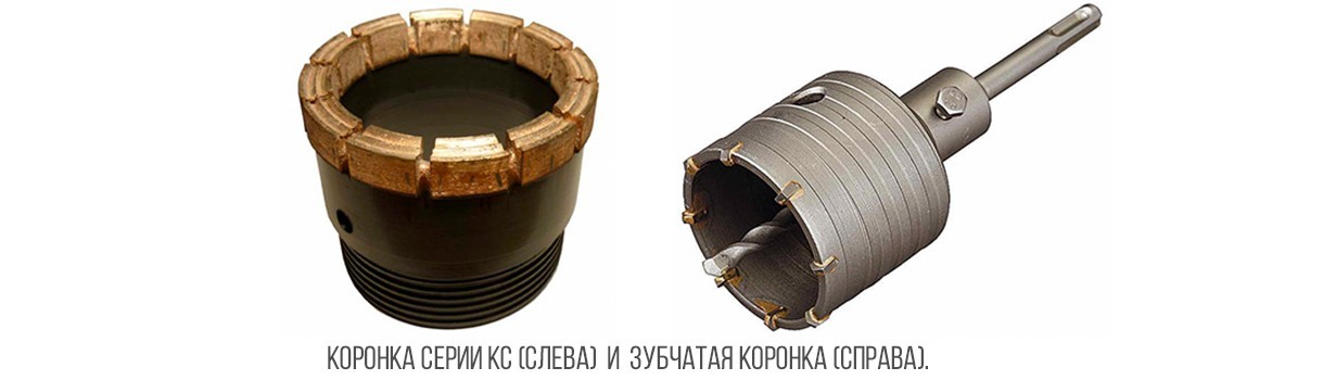 Выпускаются коронки двух основных типов:1. Серии КС. Такие коронки позволяют создавать отверстия и канавки в бетоне и иных аналогичных материалах. Поликристаллические алмазы, надежно закрепленные в матрице, формируют режущую кромку инструмента. Сократить агрессивные вибрационные воздействия позволяет безударный вариант исполнения.