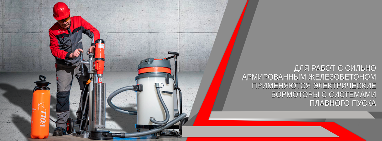 Для работ с сильно армированным железобетоном на промышленных объектах применяются электрические бормоторы с системами плавного пуска, данная функция разработана для ограничения пускового тока. Ток в данных двигателях нарастает таким образом, что их обороты растут постепенно. Плавный запуск двигателя снижает нагрузку на него его и увеличивает ресурс. Данная функция позволяет двигателям установок алмазного бурения работать безаварийно продолжительное время.Для своевременного технического обслуживания модели для работы при демонтаже зданий и сооружений оснащаются индикаторами уровня и состояния масла. Для закрепления бурильных двигателей в необходимом положении используются прочные и легкие алюминиевые колонны, дополнительную жесткость их конструкциям придает упор - откос. Основания таких станин имеют возможность регулировки с помощью юстировочных болтов.Для всех случаев применения строчного алмазного бурения используются промышленные пылесосы, которые удаляют шлам из зоны бурения.