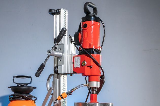Как правило, в установках алмазного бурения, используемых для создания большого количества отверстий средних диаметров, используются электрические двигатели мощностью от 3 кВт. Чаще всего используются универсальные модели с диапазоном диаметров отверстий от 40-400 мм, используются модели для работы с водой.Для регулировки сверления в данных моделях предусмотрены 3 скорости. Для напряженной работы на промышленных объектах некоторые производители к электронной защите от перегрузок дополнительно устанавливают защитные муфты. Такие модели, с двухступенчатой защитой от перегрузок наиболее надежны. Модели станин в данных установках алмазного бурения оснащены уровнем для точного позиционирования и бесступенчатым наклоном до 45 градусов.