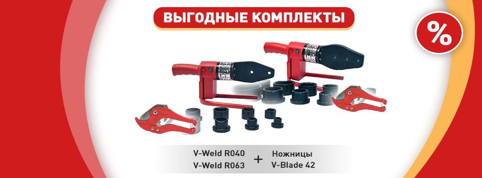 Это раструбный аппарат для сварки пластиковых труб V-Weld R040 с ножницами V-Blade 42 и сварочный аппарат V-Weld R063 с ножницами V-Blade 42.