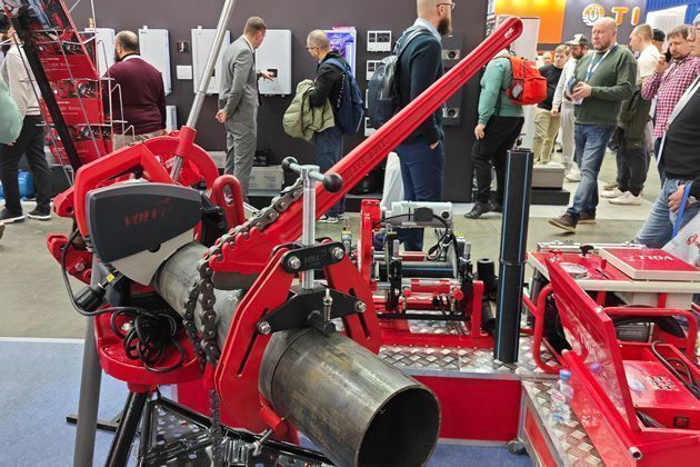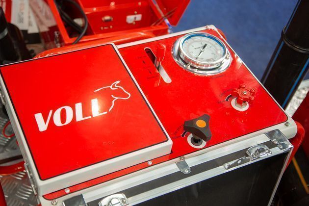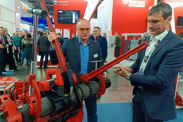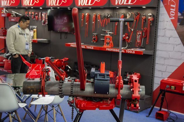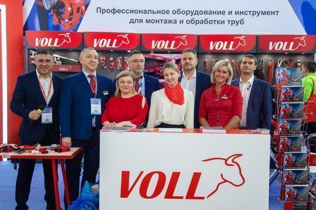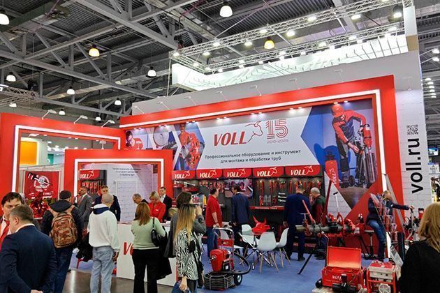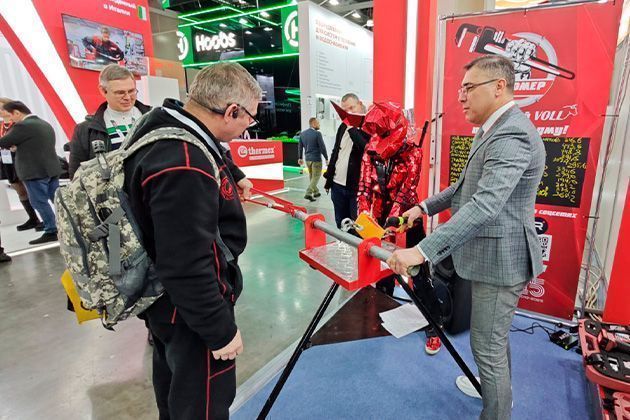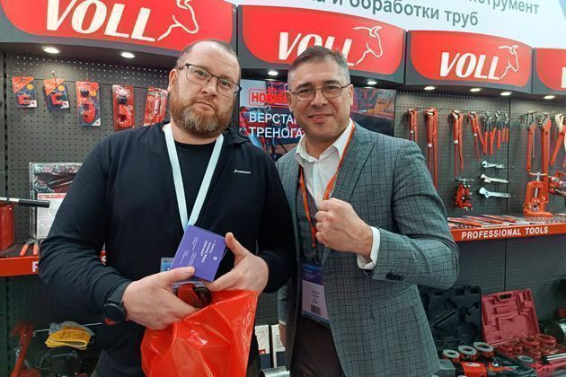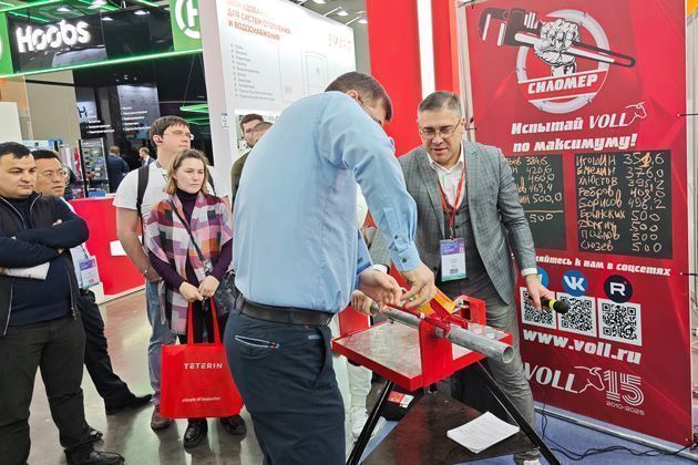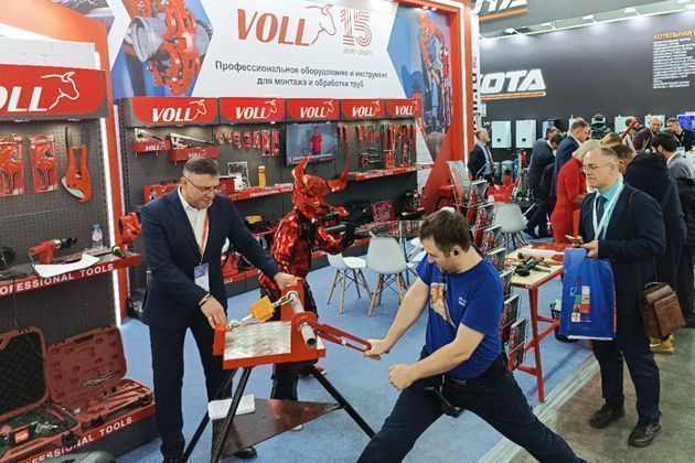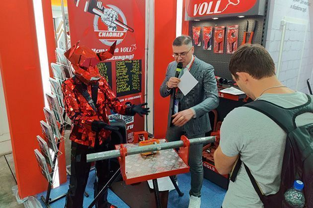 На оригинальном стенде, который специально к выставке сделали в Авторизованном сервисном центре, была закреплена стальная труба с подсоединенными крановыми весами. С помощью ключа VOLL необходимо было провернуть трубу.