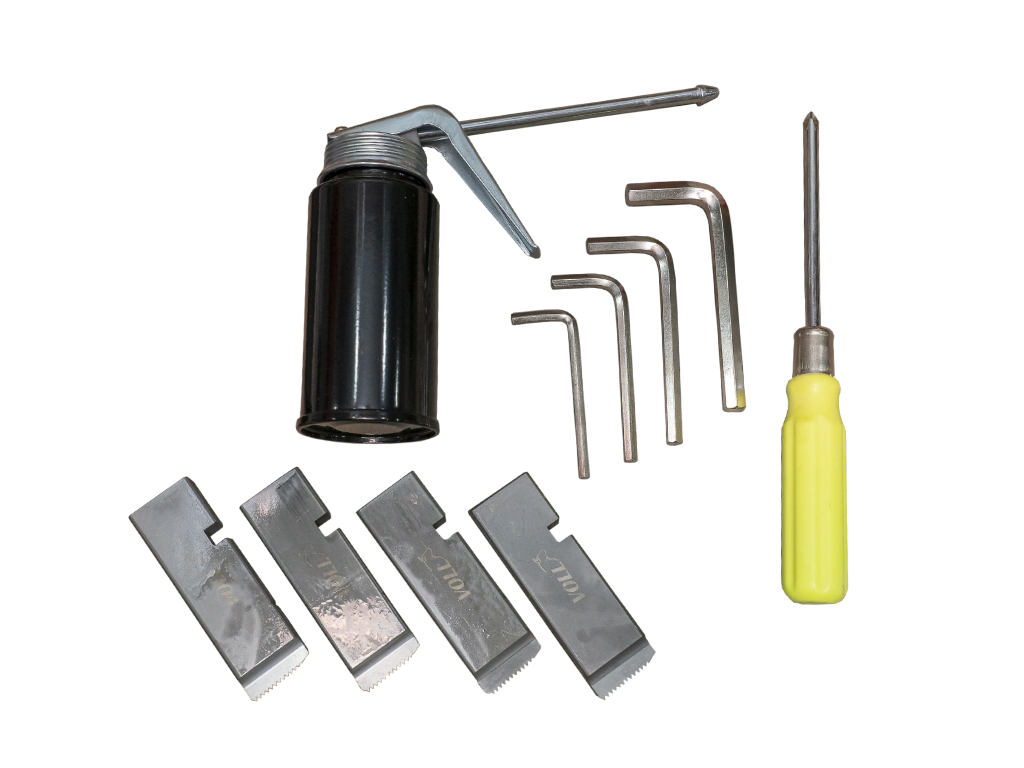 В комплектацию станка входят 3 комплекта резьбонарезных ножей: BSPT ½ - ¾ дюйма; BSPT 1-2 дюйма и 2.1/2-3 дюйма.
